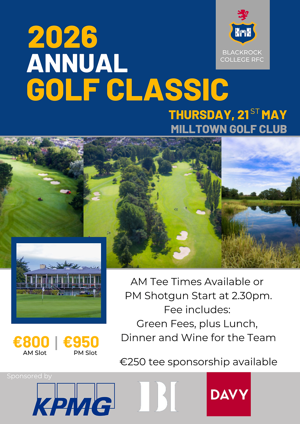 The Blackrock College RFC Golf Committee is thrilled to announce details for the 2026 Golf Classic. This annual outing always fills up, so be sure to register your team early.